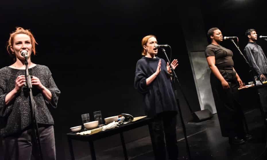On the play "Performed by four actors, each voicing quicksilver slivers of the woman’s consciousness, it has a flavour of Sarah Kane’s later work"  The actors  stand behind microphones on a bare black stage.